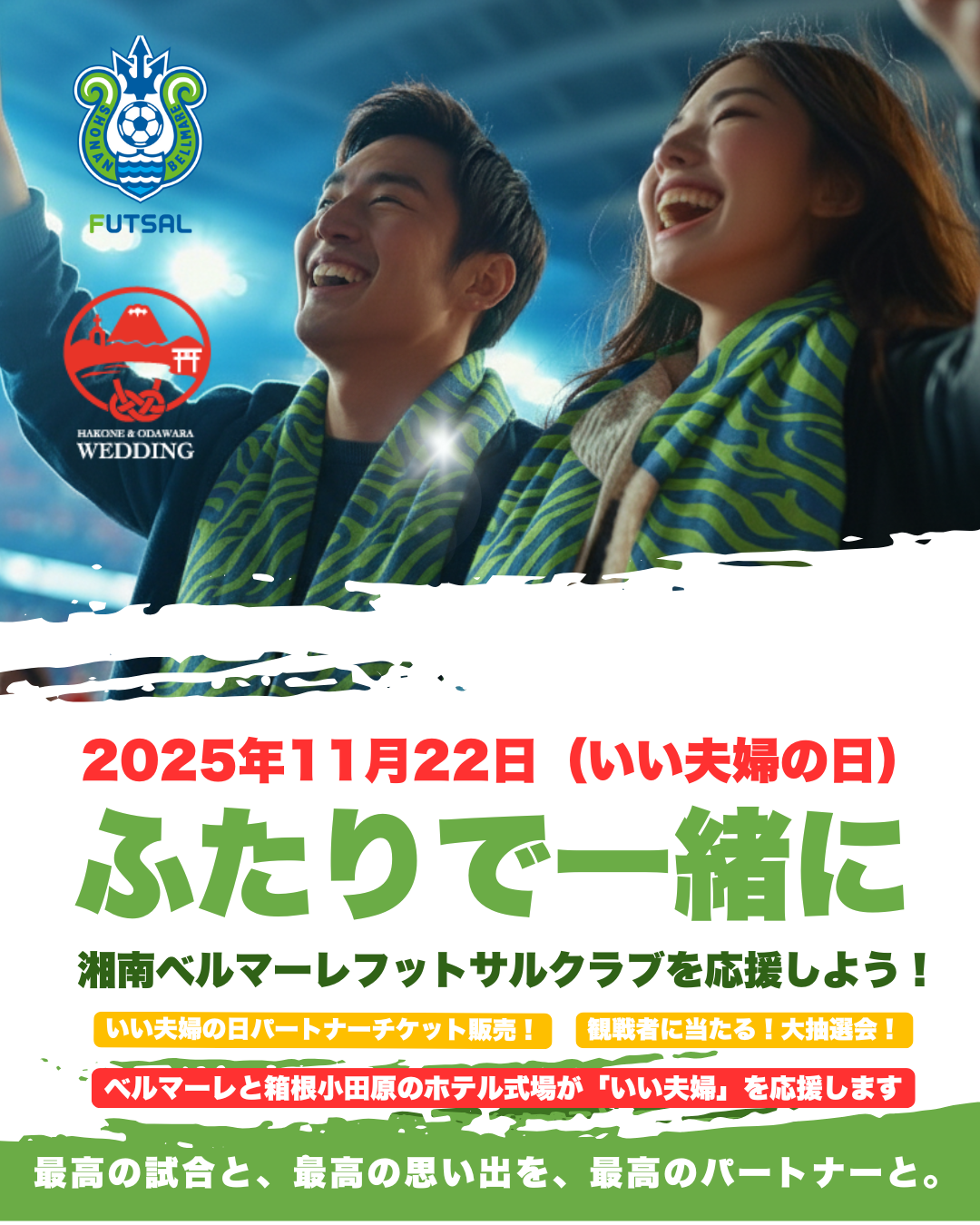 かながわ西結婚推進協議たは、Fディビジョン1に所属するプロフットサルクラブ湘南ベルマーレフットサルクラブと、来る11月22日(土)の「いい夫婦の日」に開催するホームゲームにおいて「結婚の良さ」を伝えることを目的に共同企画実施します。