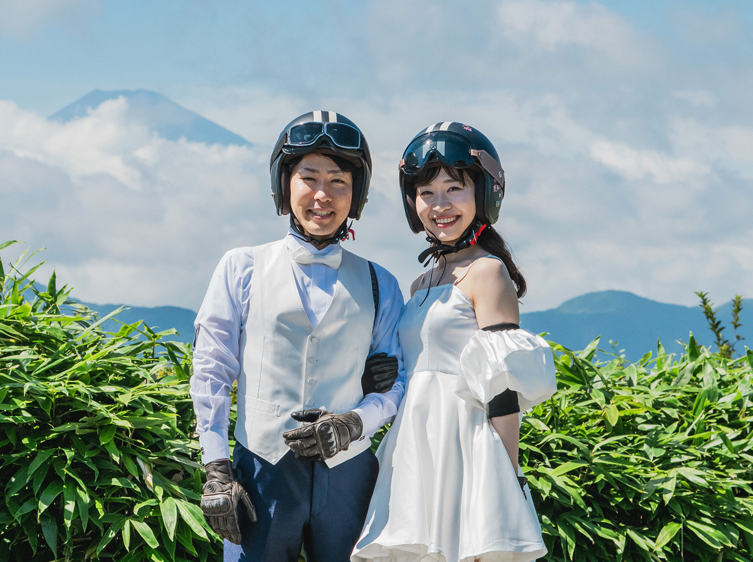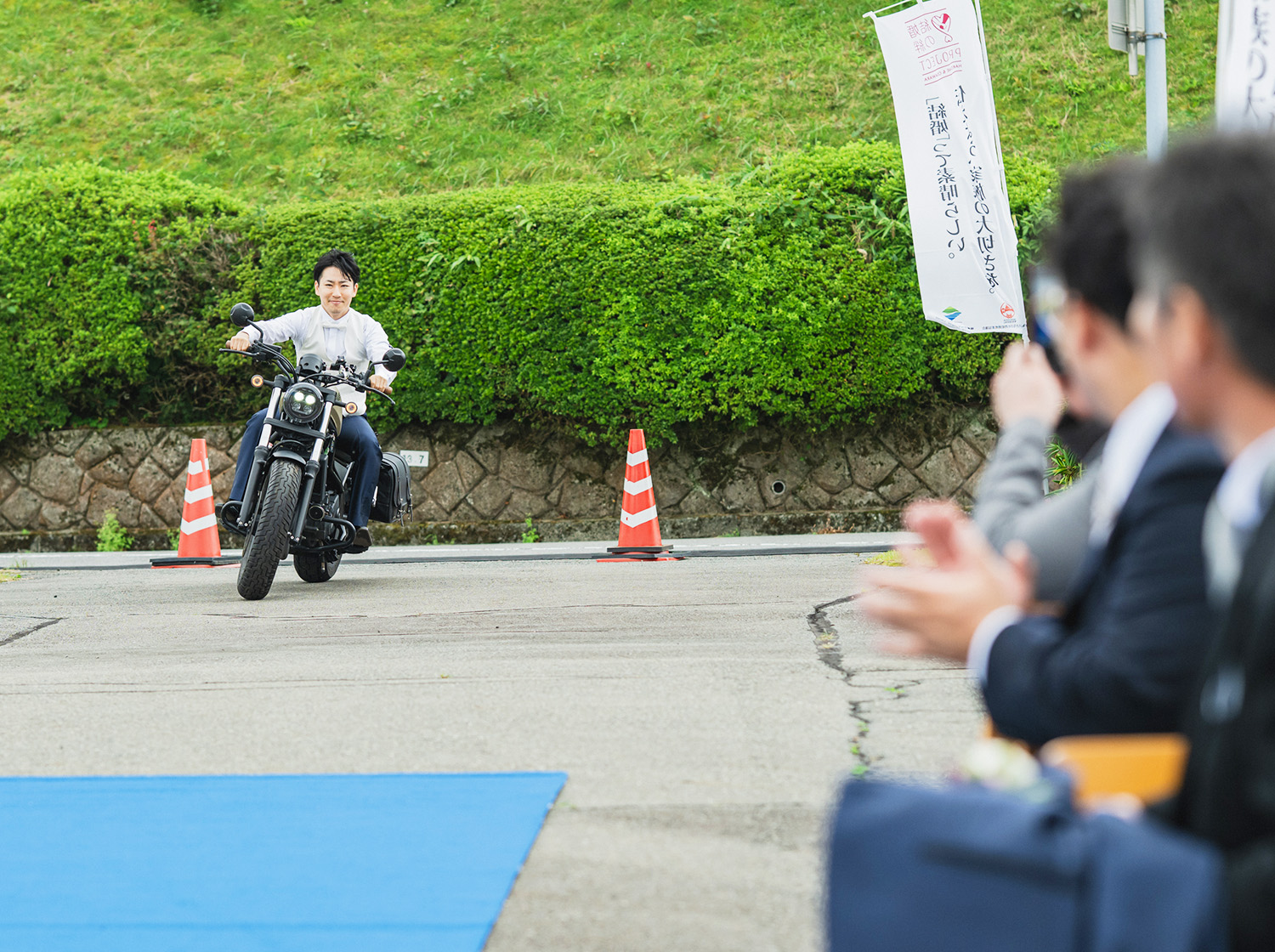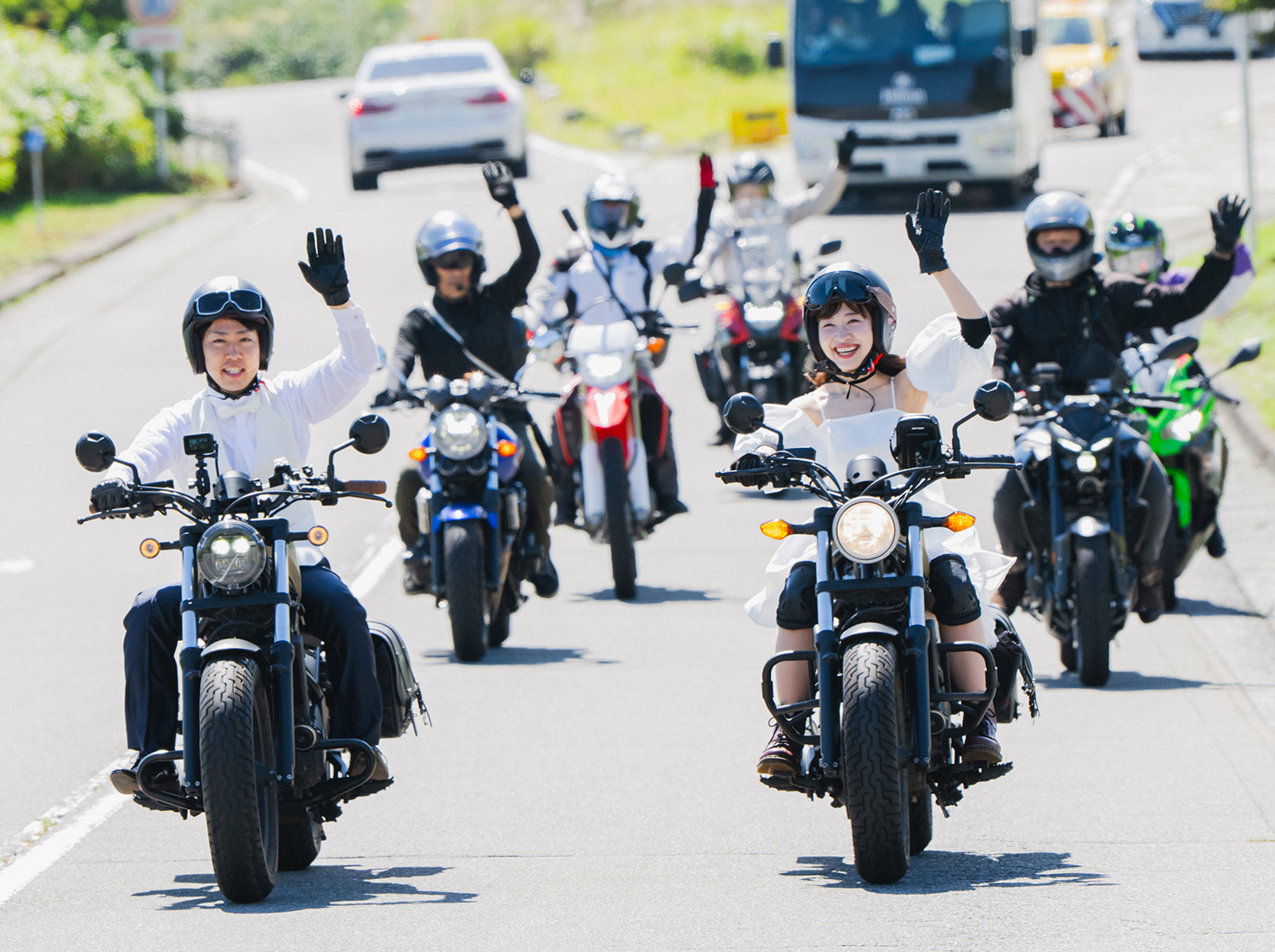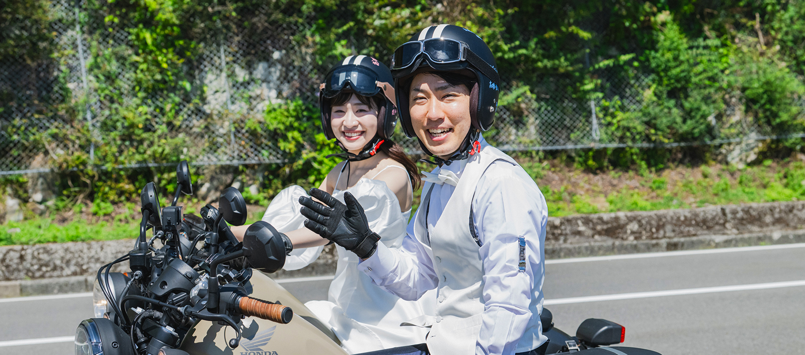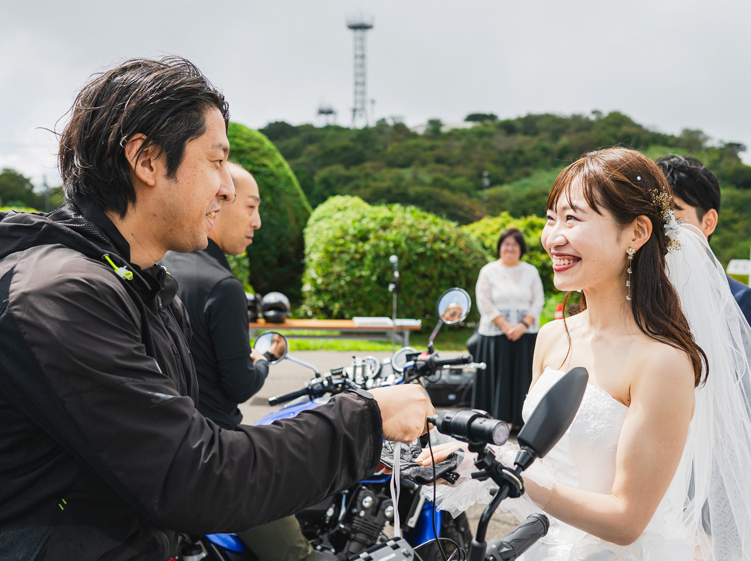 新郎がバイクで入場、新婦のツーリング仲間に愛車で指輪を運んでもらうなど、バイクを使った演出はターンパイクだからこそ叶えられた最高の演出でした!