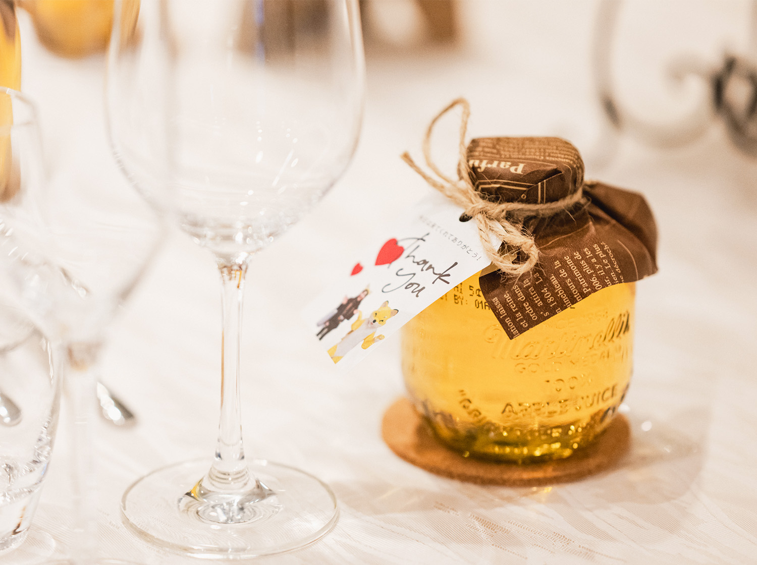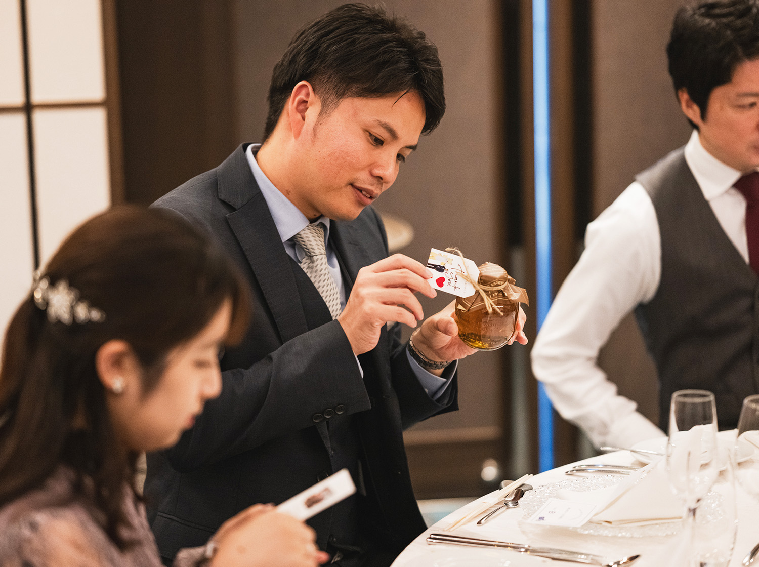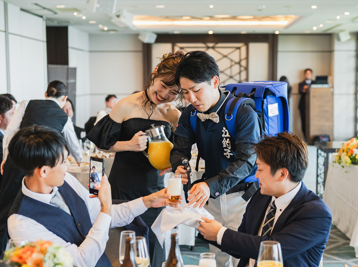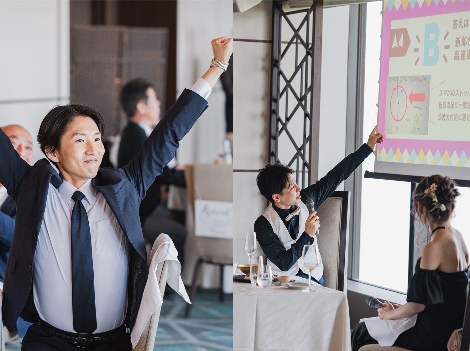 新郎が中学時代の野球部のユニフォームを着てビールサーブしたり、夫婦の馴れ初めをテーマにしたクイズ大会を企画しました。